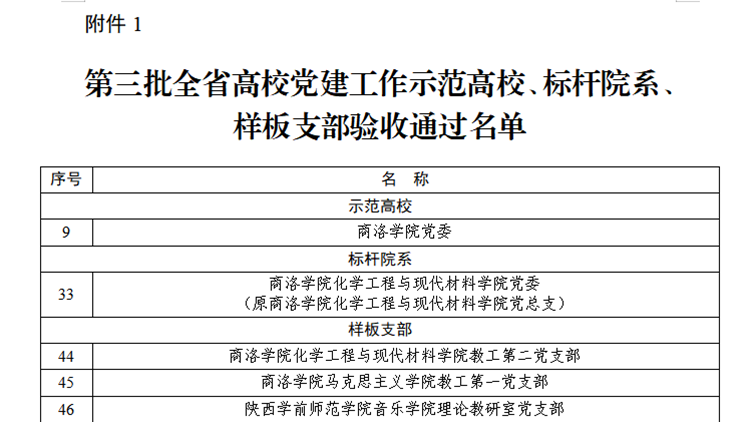 近日,陜西省委教育工委公布第三批新時代高校黨建示范創建和質量創優工作培育建設單位驗收結果,商洛學院黨委順利通過“全省黨建工作示范高校”建設驗收。學校化學工程與現代材料學院黨委,化學工程與現代材料學院教工第二黨支部、馬克思主義學院教工第一黨支部分別通過“全省黨建工作標桿院系”和“全省黨建工作樣板支部”驗收。近年來,學校黨委以入選“陜西黨建工作示范高校”培育創建單位為契機,將“分類指導 爭先進位”活...