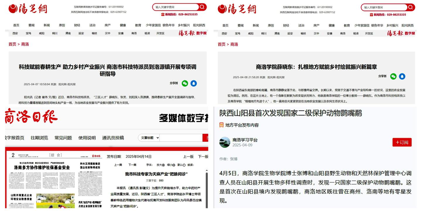 近日,學習強國學習平臺、陽光報、商洛日報等社會各界媒體紛紛報道我校教師服務秦嶺生態環境保護、助力鄉村振興和地方經濟發展的典型事跡。4月5日,學習強國刊發《陜西山陽縣首次發現國家二級保護動物鹮嘴鷸》一文,專題報道我校動物學博士張博在山陽縣關于國家二級保護動物鹮嘴鷸的重大發現,及其助力秦嶺珍稀野生動物多樣性研究和生態環境保護的工作紀實。4月7日、8日,《陽光報》分別刊發消息《科技賦能春耕生產助力鄉村產業...