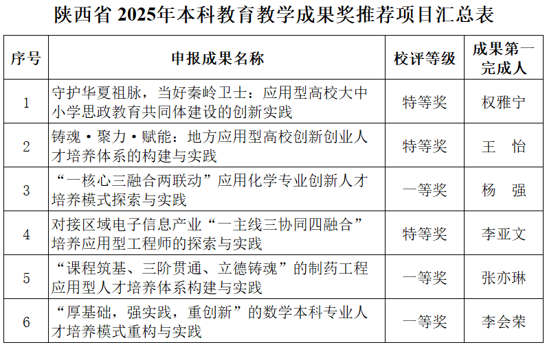 根據《關于開展2025年高等教育教學成果獎評審工作的通知》(陜教函〔2025〕688號)文件精神,我校認真組織開展高等教育教學成果獎申報工作,經各教學單位推薦,校內外專家評審,學校教學工作委員會審定,擬推薦《聚守護華夏祖脈,當好生態衛士:秦嶺腹地大中小學思想政治教育一體化建設的創新實踐》等6個項目(見下表)申報2025年陜西省高等教育教學成果獎,現予以公示。