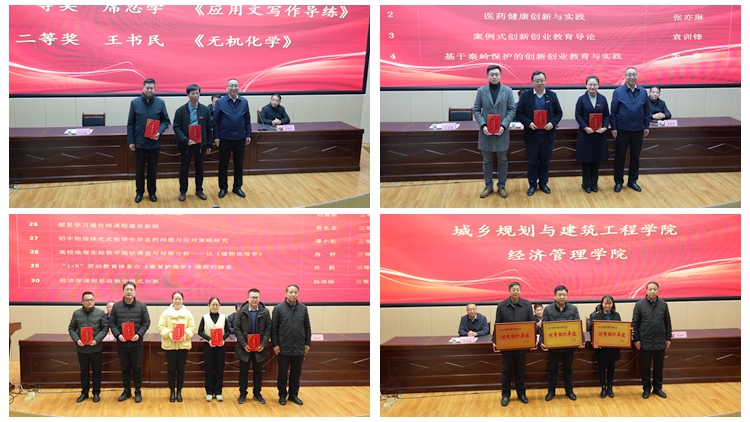 大會(huì)表彰了我校2023年教育教學(xué)研討會(huì)優(yōu)秀論文、優(yōu)秀組織單位、陜西省高等教育優(yōu)秀教材獎(jiǎng)、陜西高校創(chuàng)新創(chuàng)業(yè)課程、第二批陜西省課程思政示范課程、陜西本科教育教學(xué)改革研究項(xiàng)目、第五屆陜西本科高校教師教學(xué)創(chuàng)新大賽、陜西高校思政課程課程思政“大練兵”省級(jí)展示活動(dòng)獲獎(jiǎng)教師。