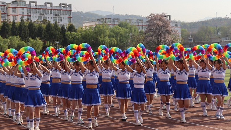 在開幕式表演中,電信學院大型團體操表演《奮進商院 禮獻祖國》驚艷綻放,240位學子在靈活變化的隊形中展露出深厚的愛國愛校之情,以無畏的勇氣和不懈的追求一起邁步向未來。健康管理學院的230余名學子步伐矯健,動作輕盈,為大家帶來活潑有力的啦啦操和洗手操表演,他們用行動向大家詮釋健康的真諦,呼吁大家參與健康生活,助力商洛“康養之都”建設。附屬小學的少年兒童以活潑可愛的身姿帶來舞蹈《盛世歡歌》,一起祝福祖國的明天天更藍、山更綠、水更清,經濟更繁榮、人民更幸福、國力更強盛!建工學院團體操表演以舞動的熱情撒播歡樂的陽光,用特有的創意和魅力展示出商院學子朝氣蓬勃的精神風貌,通過“站起來”“富起來”“強起來”三個環節,向在場觀眾勾勒出山河無恙、繁榮昌盛的盛世景象。