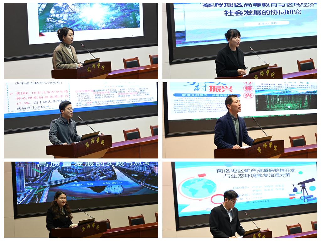 楊瑛娟、商哲、楊憲華、屈正庚、吳茜五位教師和盧科谷同學分別就商洛紅色旅游開發、秦嶺地區高等教育與區域經濟社會協同發展、商洛市域中小學心理健康教育、商洛森林康養產業發展、賽事名城建設助推商洛經濟高質量發展、商洛地區礦產資源保護性開發與生態環境修復等主題進行了學術交流。
