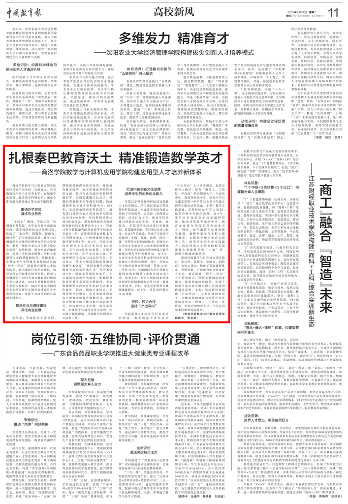 6月24日,《中國教育報》“高校新風”版面以《扎根秦巴教育沃土精準鍛造數學英才——商洛學院數學與計算機應用學院構建應用型人才培養新體系》為題刊發專題報道。文章從“圍繞辦學定位凝練專業特色”“聚焦專業與課程建設深化內涵發展”“打造科技創新文化品牌培養學生的創新創業能力”“校校、校企合作堅持‘產出導向’”四個方面全面介紹了我校數計學院扎根地方構建應用型數學人才培養新體系的實踐探索和成果經驗。