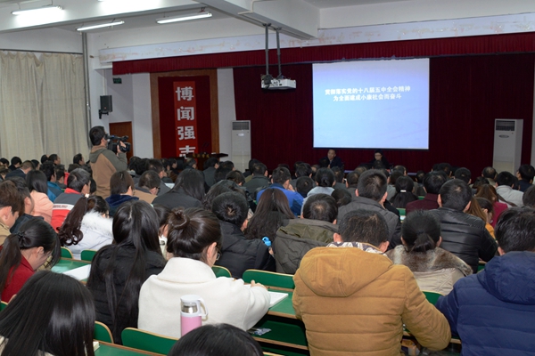 為進一步推動我校師生學習貫徹落實十八屆五中全會精神,12月9日,學校邀請陜西省委理論講師團副團長黨寧教授為師生做了題為《貫徹落實黨的十八屆五中全會精神,為全面建成小康社會而奮斗》的專題報告。校黨委委員范新會、王思懷、魏書堂、彭虎軍、劉寶盈、劉端森、高榮發,全校科級以上領導干部、輔導員,思政部、人文學院政教系全體教師,“青馬”工程學員和學生代表聽取了報告。報告會由紀委書記王思懷主持。