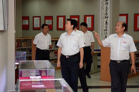 在校領(lǐng)導(dǎo)劉建林、王思懷、魏書堂、彭虎軍、劉寶盈的陪同下,莊長(zhǎng)興一行視察了我校校園環(huán)境和特色展室。