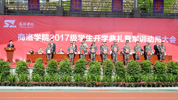 金秋送爽,丹桂飄香。9月6日上午,我校2017級學生開學典禮暨軍訓動員大會在學校體育場隆重舉行。校領導龍治剛、范新會、王思懷、魏書堂、彭虎軍、劉寶盈、劉勇,中國人民解放軍陸軍第77集團軍保障旅政治處副主任趙鑫中校,中國人民解放軍陸軍第77集團軍保障旅二營營長、商洛學院2017級學生軍訓團團長馬防少校,我校2010屆校友、商洛市旭初農林開發有限公司總經理周麗娜出席大會。各學院(部)黨政主要負責人、有關職能部門負責人及3100余名2017級新生參加大會。大會由校黨委副書記彭虎軍主持。