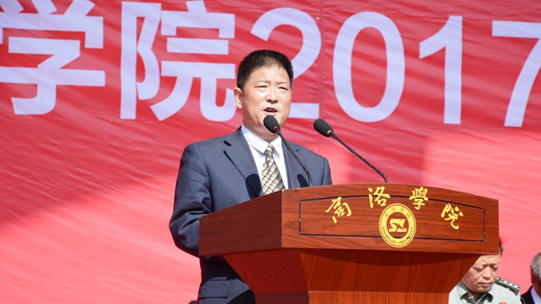 范新會代表全校師生員工對2017級新同學來商洛學院學習深造表示熱烈歡迎,對獲得“新生獎學金”的同學們表示熱烈祝賀,對承擔軍訓任務的全體官兵表示衷心的感謝,并介紹了我校的辦學歷史、辦學定位、辦學理念、辦學特色和未來發展前景。范新會指出,建校以來,我校已為國家培養了4萬余名合格人才,今天的商洛學院已經成為鑲嵌于商洛大地、丹江河畔的一張金色名片,一座為國家源源不斷培養和輸送優秀人才的黌門圣殿,以強有力的人才支持、智力支撐、文化引領和科技服務,持續推動著商洛區域經濟社會和文化發展。