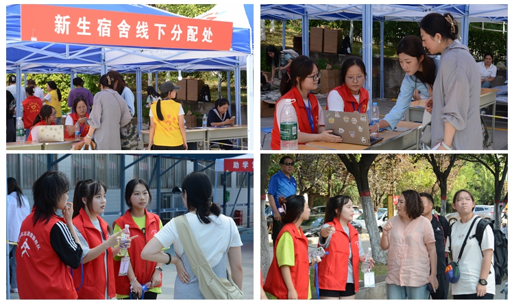 為方便新生入學,學校在各個站點設立了報到接站處,并在周邊路口安置指引路標。在校園內,醒目的迎新標語、熱情的志愿者隨處可見,學校還設立了臨時醫療服務區,為新生、家長及工作人員提供及時的醫療保障。在各緊要路口設立志愿服務區,為新生和家長提供校園指引和飲用水等服務。在新生報名處和玉蘭廣場設立的資格審查、助學貸款回執辦理、學費繳納等接待平臺前,新生正有序排隊辦理各項手續,秩序井然。