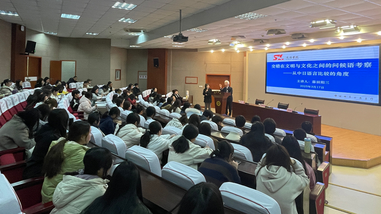 報告會上,藤田陽三教授以《交錯在文明與文化之間的問候語考察——從中日語言比較的角度》為題,通過列舉實例,詳細對比了中日問候語在表達方式、使用場景和蘊含寓意上的異同。他認為,國家和地區的文明和文化都融合在語言之中,問候語作為人際溝通交流的開始,能清晰映照出中日兩國在社會結構、價值觀念上的區別,具有重要意義,青年學子要感受、體驗不同的文化魅力,為中日兩國的友好交流作出貢獻。陜西師范大學外國語學院日語教師王紅作報告會現場翻譯。