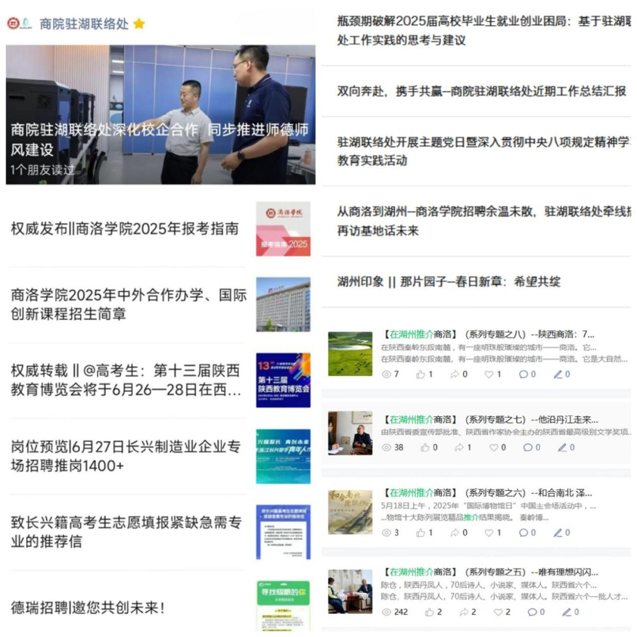 講好商院故事,提升社會影響力。通過“商院駐湖聯(lián)絡處”公眾號發(fā)布聯(lián)絡處工作動態(tài)、階段性工作總結、學校重點新聞、就業(yè)政策解讀、企業(yè)招聘動態(tài)等內容260余篇。其中,發(fā)布“在湖州推介商洛”系列內容8篇,發(fā)表《商洛學院駐湖州就業(yè)人才工作聯(lián)絡處積極開展系列活動》《雙向奔赴,攜手共贏--商院駐湖聯(lián)絡處近期工作總結匯報》《湖州·商洛學院:共譜雙向奔赴之華章》等總結綜述性文章6篇,構筑起“信息集散地”與“校地交流窗口”的雙向樞紐,既主動向外展示學校形象、聯(lián)絡處成果與商洛特色,亦向內傳遞湖州產業(yè)生態(tài)、就業(yè)趨勢與政策紅利。