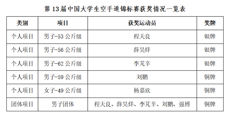 近日,在浙江省溫州市永嘉縣舉行的第13屆中國大學生空手道錦標賽上,我校空手道代表隊奮勇拼搏、發揮出色,共獲得3枚銀牌、2枚銅牌及男子團體銅牌。隊員范思宇榮獲“優秀運動員”稱號,體育教學研究部教師桑國鵬獲評“優秀教練員”。