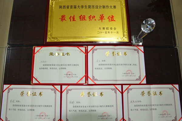 11月27日,陜西省首屆大學生簡歷設計制作大賽總決賽在西安文理學院舉行,我校有5名學生進入總決賽。經過專家評審,電信學院學生李浩榮獲二等獎,經管學院學生徐娜,文傳學院學生梁娟、程競爽榮獲最佳網絡人氣獎;我校同時榮獲大賽最佳組織單位獎,招生就業處楊建峰榮獲優秀指導教師獎。