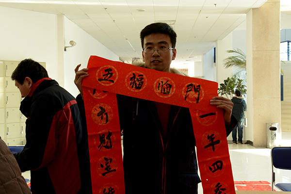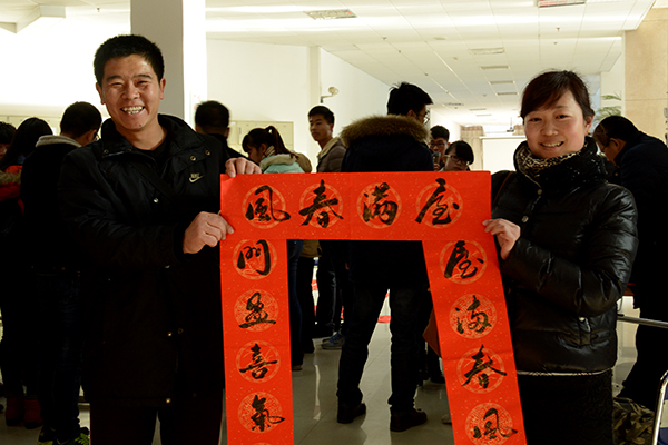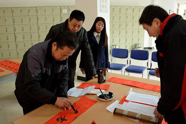 活動(dòng)現(xiàn)場(chǎng),“五湖四海皆春色 萬(wàn)水千山盡得輝”、“和順一門有百福 平安二字值千金” 、“綠竹別其三分景 紅梅正報(bào)萬(wàn)家春”、“壯麗山河多異彩 文明國(guó)度遍高風(fēng)”……一張張紅紙上寫滿了新春的祝福語(yǔ)。師生們圍繞在書法家周圍選擇自己心儀的祝福話語(yǔ),書法家們揮毫潑墨,一一滿足廣大師生的心愿,淡淡的墨香伴著師生幸福的笑臉為校園增添了濃濃的年味。