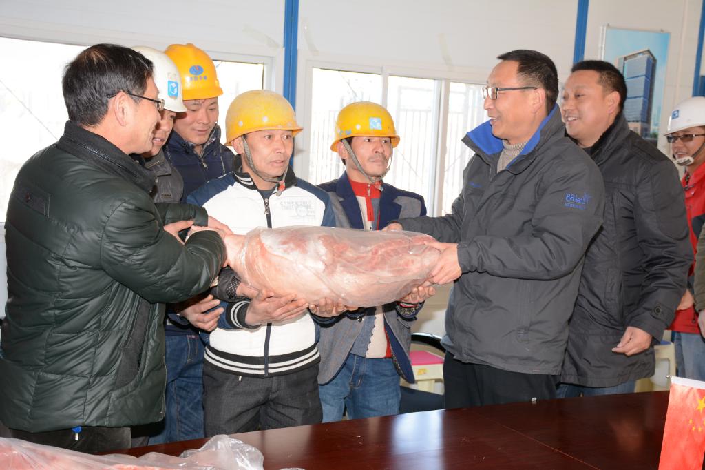 在座談會上,劉寶盈首先代表學校對參與我校項目建設的施工方工作人員的辛勤付出表示衷心感謝,在春節到來之際,對他們表示慰問,送上了大肉、花生等生活慰問品。他噓寒問暖,詳細地詢問工人們的工作、生活等方面的情況、工資的發放情況。在了解到工人們對各方面都感到滿意之后,表示很欣慰。最后,對參加我校基建項目建設的所有工作人員及其家庭致以春節的祝福。項目工作人員對學校的慰問表示衷心的感謝。