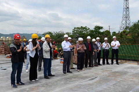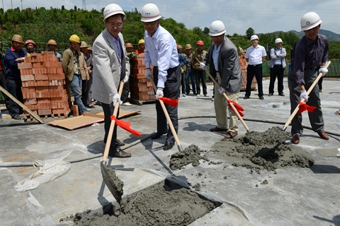 在儀式現(xiàn)場,劉寶盈及參加封頂儀式的代表們鏟起混凝土,共同為青年教師公寓和學生公寓樓封頂。