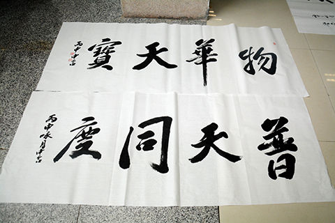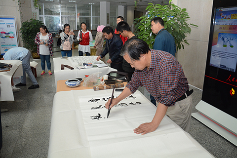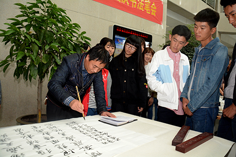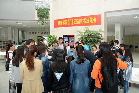 9月28日下午,由宣傳部、工會(huì)、校書法協(xié)會(huì)聯(lián)合舉辦的“迎國慶書法筆會(huì)”在圖書館一樓大廳舉行。校書協(xié)會(huì)員們?cè)缭鐏淼浆F(xiàn)場,調(diào)墨、潤筆、揮毫,一幅幅作品從筆端涌出,飽含著對(duì)偉大祖國的深深眷戀與真摯祝福!現(xiàn)場引來同學(xué)們的熱情圍觀,也引發(fā)了青年學(xué)子的廣泛共鳴。
