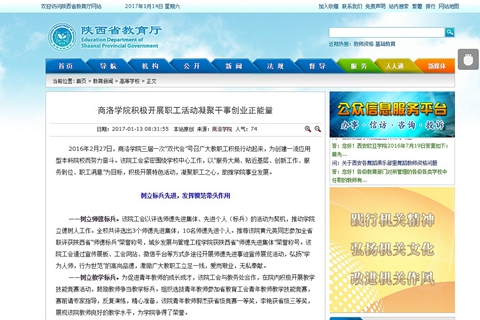 1月13日,陜西省教育廳官網(wǎng)以《商洛學(xué)院積極開(kāi)展職工活動(dòng)凝聚干事創(chuàng)業(yè)正能量》為題,對(duì)我校工會(huì)2016年工作成果進(jìn)行了全面報(bào)道。文章指出,2016年,我校三屆一次“雙代會(huì)”號(hào)召?gòu)V大教職工積極行動(dòng)起來(lái),為創(chuàng)建一流應(yīng)用型本科院校而努力奮斗。校工會(huì)緊密圍繞學(xué)校中心工作,以“服務(wù)大局、貼近基層、創(chuàng)新工作、服務(wù)到位、職工滿意”為目標(biāo),圍繞“樹(shù)立標(biāo)兵先進(jìn),發(fā)揮模范帶頭作用;豐富職工生活,凝聚發(fā)展正能量;關(guān)心關(guān)愛(ài)職工,凝聚發(fā)展人心”等方面,積極開(kāi)展特色活動(dòng),收獲了成功與喜悅,凝聚了人心,增強(qiáng)了教職工的歸屬感和認(rèn)同感,匯集了學(xué)校發(fā)展正能量。