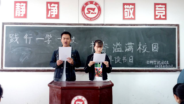 本次活動主要由經典詩文朗誦、經典著作讀書分享、習近平總書記系列重要講話研讀以及簽名活動四部分組成,一方面號召廣大師生多讀書、讀好書、會讀書,另一方面引導廣大青年團員認真研讀習近平總書記關于治國理政治的專著和系列重要講話,認真領會習近平總書記的治國理政新理念新思想新戰略,堅定理想信念,踐行“一學一做”,做合格共青團員。