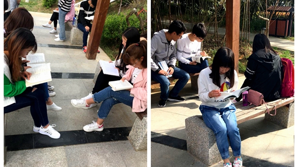 早上8點,同學們帶著自己喜歡的書籍來到竹園,沐浴著陽光大聲地朗讀,校園里充滿了濃濃的書香。有的同學將自己喜歡的書籍推薦給同學,進行知識的傳遞;有的同學將自己喜歡的文章繪聲繪色讀給同學,贏得了在場師生的陣陣掌聲。