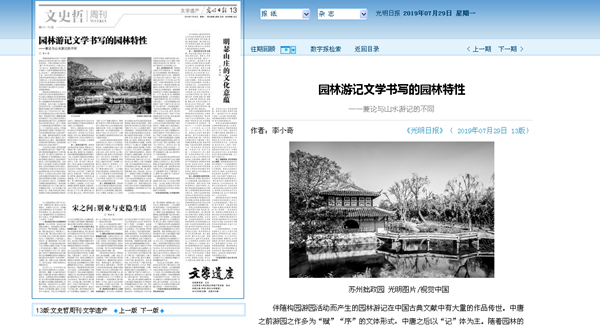 我校人文學院教師李小奇在《光明日報》2019年7月29日文史哲周刊發表學術文章《園林游記文學書寫的園林特性》,全文如下: