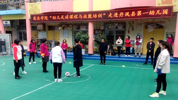 為進一步做好結對幫扶助力丹鳳脫貧攻堅工作,推進丹鳳縣幼兒足球示范園建設,我校與丹鳳縣科教體局于11月20日在丹鳳縣第一幼兒園共同舉辦了“幼兒足球課程與技能培訓”活動。我校“雙百工程”項目首席專家朱小強,體育教學研究部足球教師楊斌,丹鳳縣農業(yè)農村局、科教體局相關人員,丹鳳縣5所示范園和5所民辦幼兒園負責人及相關教師參加了此次活動。