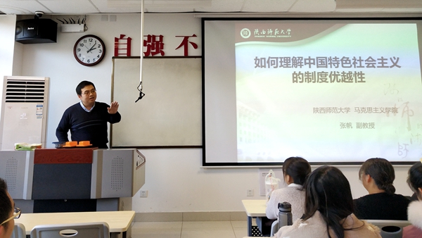 為深入學習黨的十九屆四中全會精神,促進思政課教學改革,提高課堂教學質量。12月4日下午,我校特邀“陜西高校思政課教師大練兵”教學標兵、陜西師范大學副教授張帆來校,以《如何理解中國特色社會主義制度的優越性》為題講述了一堂公開示范課。我校馬克思主義學院班子成員、全體教師及思政1801班學生聆聽了示范課。