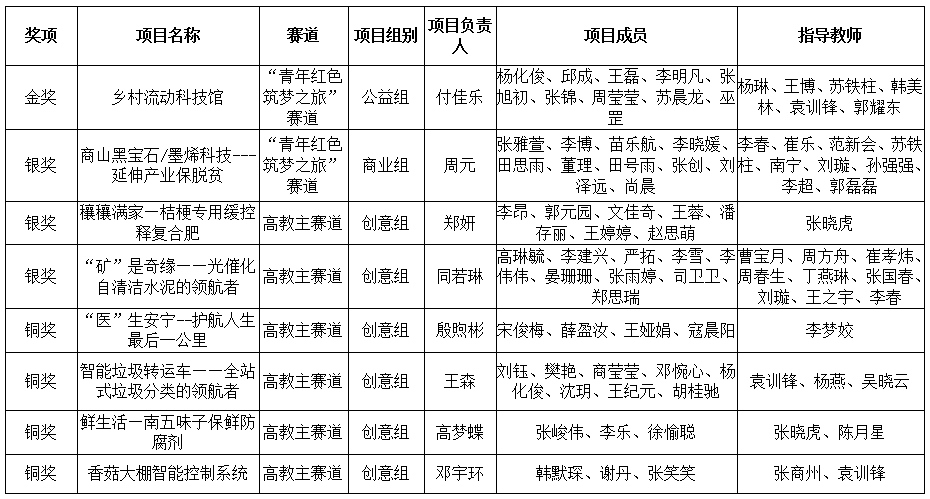 本屆大賽自今年6月啟動以來,我省共有106所學(xué)校報(bào)名參加,參賽項(xiàng)目突破4萬項(xiàng),較去年增加近3000項(xiàng),參賽學(xué)生突破18.4萬人次,較去年增加1.8萬,經(jīng)校級初賽、網(wǎng)絡(luò)初審、會議評審、線上路演、評委會評審等環(huán)節(jié)后,最終產(chǎn)生金獎100項(xiàng),單項(xiàng)獎7項(xiàng)。我校化材學(xué)院學(xué)生付佳樂負(fù)責(zé)的《鄉(xiāng)村流動科技館》項(xiàng)目獲“青年紅色筑夢之旅”賽道金獎;化材學(xué)院學(xué)生周元負(fù)責(zé)的《商山黑寶石/墨烯科技---延伸產(chǎn)業(yè)保脫貧》項(xiàng)目獲得“青年紅色筑夢之旅”賽道銀獎;生物學(xué)院學(xué)生鄭妍負(fù)責(zé)的《穰穰滿家—桔梗專用緩控釋復(fù)合肥》項(xiàng)目、化材學(xué)院學(xué)生同若琳負(fù)責(zé)的《“礦”是奇緣——光催化自清潔水泥的領(lǐng)航者》項(xiàng)目獲得高教主賽道銀獎;健康管理學(xué)院學(xué)生殷煦彬負(fù)責(zé)的《“醫(yī)”生安寧--護(hù)航人生最后一公里》項(xiàng)目、生物學(xué)院學(xué)生高夢蝶負(fù)責(zé)的《鮮生活—南五味子保鮮防腐劑》項(xiàng)目、電信學(xué)院學(xué)生王森負(fù)責(zé)的《智能垃圾轉(zhuǎn)運(yùn)車——全站式垃圾分類的領(lǐng)航者》項(xiàng)目、電信學(xué)院學(xué)生鄧宇環(huán)負(fù)責(zé)的《香菇大棚智能控制系統(tǒng)》項(xiàng)目獲得高教主賽道銅獎。