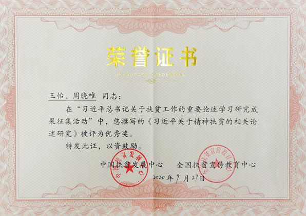 本次評選活動是對國內相關高校、智庫及研究機構,學習貫徹落實習近平總書記關于扶貧工作重要論述最新理論和實踐成果的一次大檢閱,經過初評、復評和終評環節,最終評選出98件獲獎作品。《習近平關于精神扶貧的相關論述研究》是國家社科基金項目“連片貧困地區精準扶貧成效評估及‘阻返’長效機制研究”的前期研究成果之一,該成果系統梳理了習近平總書記關于精神扶貧重要論述的形成歷程,解讀了習近平總書記關于精神扶貧重要論述的理論內涵與主要內容,闡述了習近平總書記關于精神扶貧重要論述的重要實踐價值,揭示了習近平總書記關于精神扶貧相關論述的重大歷史和時代意義,為進一步深入研究習近平總書記扶貧思想提供了理論參考。