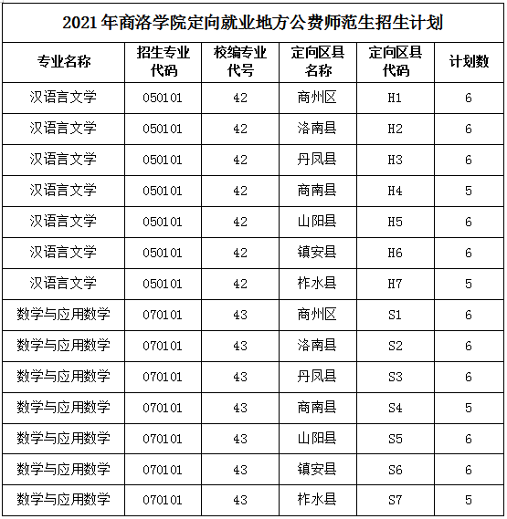 2021年我校招收定向就業地方公費師范生的專業有漢語言文學和數學與應用數學,招生計劃各40名,分別以定向就業商洛市各區、縣設置招生代碼,招生批次為提前批本科。