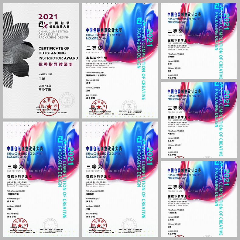 近日,由中國包裝聯合會舉辦的2021年中國包裝創意設計大賽圓滿結束,我校師生踴躍參賽,共獲得二等獎2項,三等獎11項,優秀獎14項,1名教師獲得“優秀指導教師”獎。