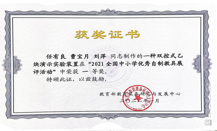 近日,教育部教育裝備研究與發(fā)展中心舉辦了“2021全國(guó)中小學(xué)優(yōu)秀自制教具展評(píng)活動(dòng)”,我?;瘜W(xué)工程與現(xiàn)代材料學(xué)院教師任有良、曹寶月、劉萍的參展作品“一種雙控式乙炔演示實(shí)驗(yàn)裝置”獲全國(guó)一等獎(jiǎng),任有良獲“全國(guó)自制教具能手”稱(chēng)號(hào)。