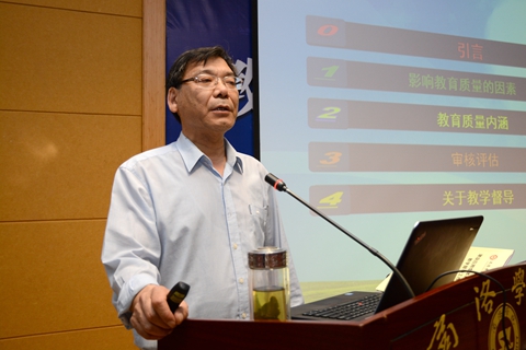 研討會上,韓江水教授作了《審核評估與教學督導》的主題報告。報告分析了當前高等教育面臨的形勢與任務、內(nèi)部與外部環(huán)境、機遇與挑戰(zhàn),指出以提升教學質(zhì)量為核心的內(nèi)涵式發(fā)展已經(jīng)成為高等教育的主題,高校教育綜合改革已經(jīng)展開,地方本科高校轉(zhuǎn)型發(fā)展不斷深化。報告從影響教育質(zhì)量的因素、如何提高與保障教育質(zhì)量、審核評估、關(guān)于教學督導的思考四部分,進行了詳細、系統(tǒng)地講解,分析了教學督導職能的變革與轉(zhuǎn)變、督導工作方式方法的創(chuàng)新,提出了“三督一專兩機一平”的督導模式。