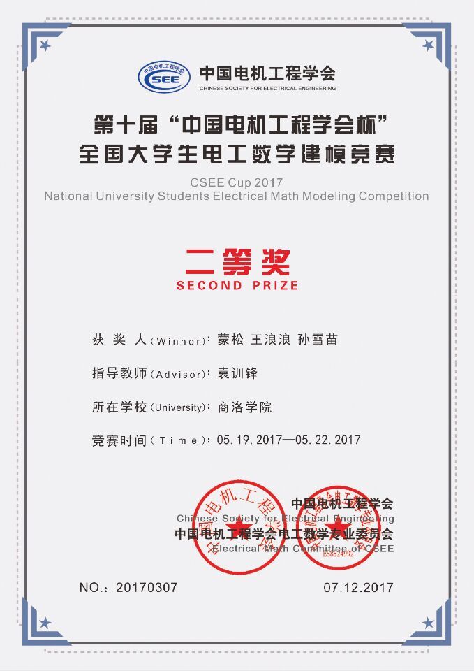 近日,由中國電機工程學會批準、電工數學專委與全國大學生電工數學建模競賽組委會主辦的第十屆“中國電機工程學會杯”全國大學生電工數學建模競賽結果揭曉。我校蒙松、王浪浪、孫雪苗等3個團隊榮獲國家級學會二等獎,卞靜偉、趙菡、張睿赟等7個團隊榮獲國家級學會三等獎,這是我校組隊參加此項賽事以來獲得的最佳成績。