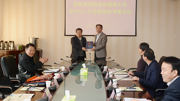 11月23日,西安外國語大學黨委書記鄧志輝一行5人來我校考察交流,黨委書記龍治剛、黨委副書記彭虎軍陪同考察并與鄧志輝一行進行了座談交流。