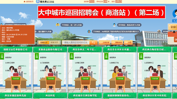 本次招聘會(huì)依托貓頭英云就業(yè)平臺(tái)開(kāi)展,吸納了省內(nèi)外246家用人單位參會(huì),其中包括河南國(guó)控建設(shè)集團(tuán)有限公司、國(guó)核寶鈦鋯業(yè)股份公司、寧夏建龍?zhí)劁撚邢薰尽㈥兾鞯氐V第二工程勘察院有限公司等業(yè)內(nèi)知名企業(yè)以及西安城市交通技師學(xué)院、西安信息工程技師學(xué)院等師范教育類(lèi)用人單位,為我校畢業(yè)生提供土木土建、師范教育、電子商務(wù)、外語(yǔ)外貿(mào)、學(xué)前教育、電氣工程、金融會(huì)計(jì)、化學(xué)化工、生物醫(yī)藥等多個(gè)行業(yè)領(lǐng)域的有效對(duì)口崗位達(dá)6930多個(gè)。招聘會(huì)開(kāi)展期間,我校1787名畢業(yè)生參會(huì),在線(xiàn)參加面試926人(次),達(dá)成初步就業(yè)意向334人(次)。