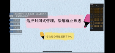 為舒緩疫情期間已返校畢業(yè)生因就業(yè)壓力而產(chǎn)生的焦慮情緒,幫助其做好心理調(diào)適和學(xué)習(xí)生活規(guī)劃,5月20日下午,我校學(xué)生處心理健康教育中心舉辦了以“適應(yīng)封閉式管理,緩解就業(yè)焦慮”為主題的線上主題講座。