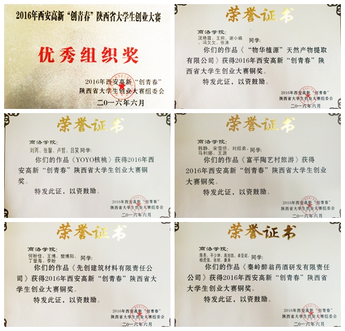 6月2日,2016年西安高新“創青春”陜西省大學生創業大賽頒獎典禮在西北大學舉行。我校學生的《秦嶺醉翁藥酒研發有限責任公司》《先創建筑材料有限責任公司》《商洛YOYO核桃觀光工廠》《陜西富平陶藝村專線旅游服務》《物華植源天然產物提取有限公司》等五個項目榮獲銅獎,學校獲得“優秀組織獎”。