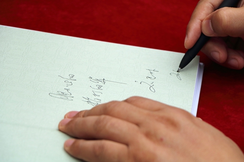 在莘子苑入口,畢業生排隊熱烈歡迎劉建林校長。劉建林現場向畢業生贈送了自己編著的《跨流域調水工程補償機制研究——以南水北調(中線)工程商洛水源為例》一書,并在書上題寫了“膽大心細,精打細算”的贈語及簽名。簽名贈書現場人頭攢動,畢業生們圍繞在劉建林身邊,爭先恐后領取贈書。拿到劉校長親筆簽名的書籍,同學們臉上流露出了激動和幸福的表情。