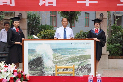 簽名贈書儀式結束后,建工學院畢業生為了表達對母校的感謝之情,向母校贈送了學生徐煥章所作的國畫《海納百川》作為紀念。