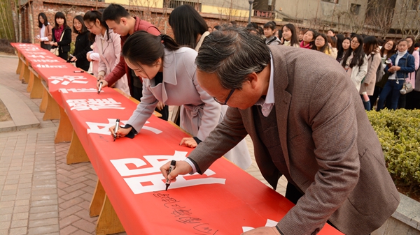 3月9日,文傳學(xué)院學(xué)子在莘子苑舉行“雷鋒月”活動啟動儀式,學(xué)子們在“志愿服務(wù)耀商洛,青春共筑中國夢”橫幅上簽下自己的名字,紛紛表示要傳承雷鋒精神、踐行社會主義核心價值觀。