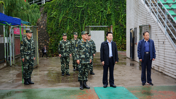 9月18日,武警陜西省總隊副參謀長連文生大校、武警商洛支隊支隊長王平上校、武警商洛支隊政委梁棟上校一行冒雨來我校視察慰問承訓教官與參訓師生。黨委副書記彭虎軍陪同檢查。