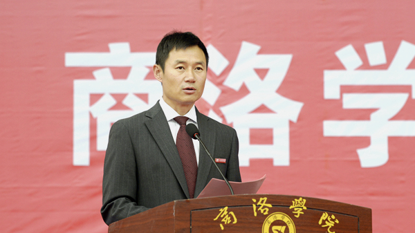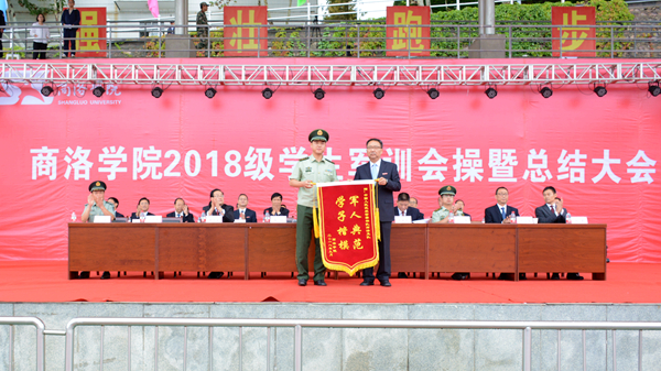 大會在莊嚴雄壯的國歌聲中拉開帷幕。校黨委書記龍治剛對全體承訓教官不畏風雨、認真負責、辛勤努力的付出表示感謝,并代表學校向中國人民武警部隊商洛支隊贈送了寫有“軍人典范 學子楷模”的錦旗。