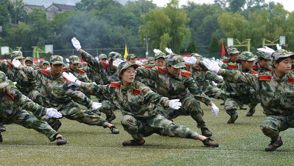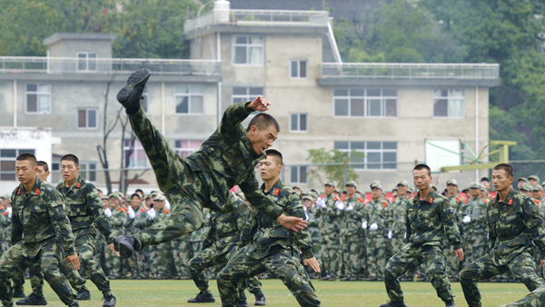 分列式結束后,軍訓教官和學生進行了格斗、匕首操、五步拳匯報表演。教官們精彩的格斗表演氣勢威猛如虎、出手灑脫有力,盡展果敢剛強的軍人本色,讓人熱血沸騰;女兵們表演的匕首操動作整齊、聲音洪亮,完美詮釋了“巾幗不讓須眉”的豪情壯志;全體參訓學生共同完成的五步拳表演扎實穩健、氣勢磅礴,展現了我校學子昂揚的青春斗志,引起了現場師生陣陣歡呼與掌聲。