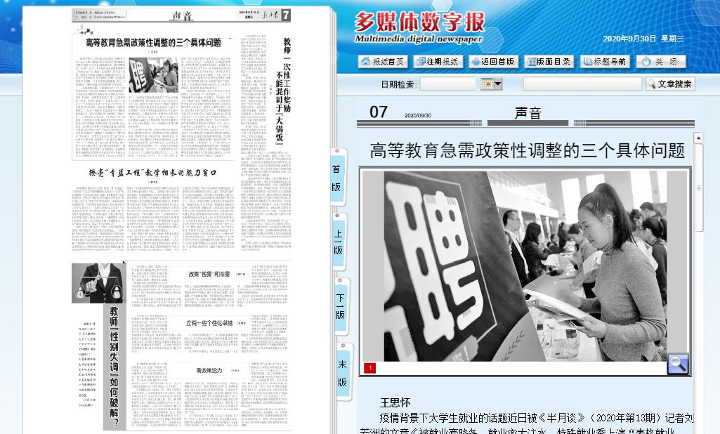 陜西高校教學(xué)名師、商洛市名師、我校馬克思主義學(xué)院教授王思懷在《教師報(bào)》2020年9月30日理論版面頭條位置發(fā)表署名文章,直面高等教育就業(yè)率、獎(jiǎng)助學(xué)金、學(xué)業(yè)縮水問(wèn)題,全文如下: