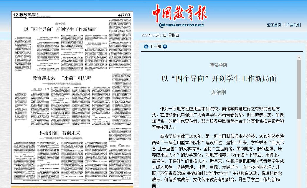1月7日,校黨委書記龍治剛在《中國教育報》教改風(fēng)采版面發(fā)表署名文章《商洛學(xué)院:以“四個導(dǎo)向”開創(chuàng)學(xué)生工作新局面》。