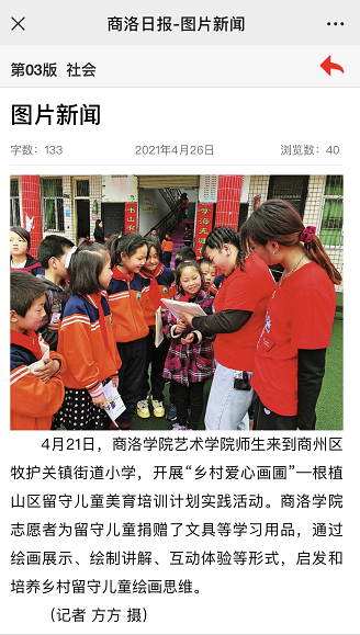 4月26日,商洛日報三版社會版面對我校承擔(dān)的公益項目“鄉(xiāng)村愛心畫圃”走進(jìn)商州區(qū)牧戶關(guān)街道小學(xué)開展公益活動進(jìn)行了報道,原文如下: