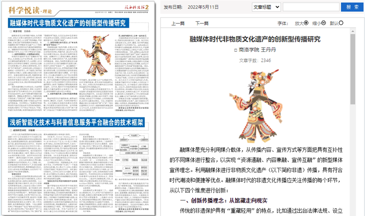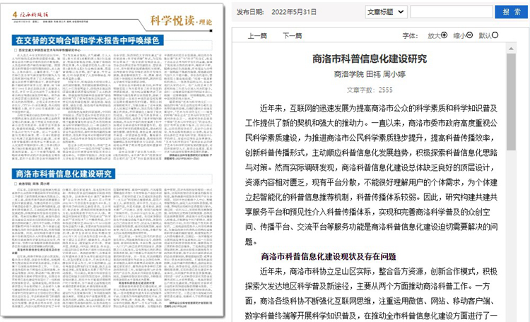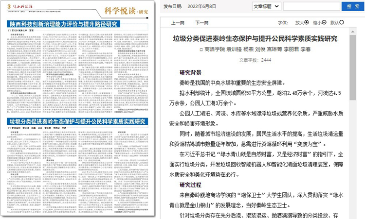 5月份以來,我校教師袁訓(xùn)鋒、田祎、王丹丹先后在《陜西科技報》理論版刊發(fā)《垃圾分類促進(jìn)秦嶺生態(tài)保護(hù)與提升公民科學(xué)素質(zhì)實踐研究》《商洛市科普信息化建設(shè)研究》《融媒體時代非物質(zhì)文化遺產(chǎn)的創(chuàng)新型傳播研究》三篇文章,圍繞秦嶺生態(tài)保護(hù)、科普信息化建設(shè)、非物質(zhì)遺產(chǎn)創(chuàng)新傳播等主題,介紹我校科研服務(wù)地方實踐成果和經(jīng)驗。文章主要內(nèi)容如下: