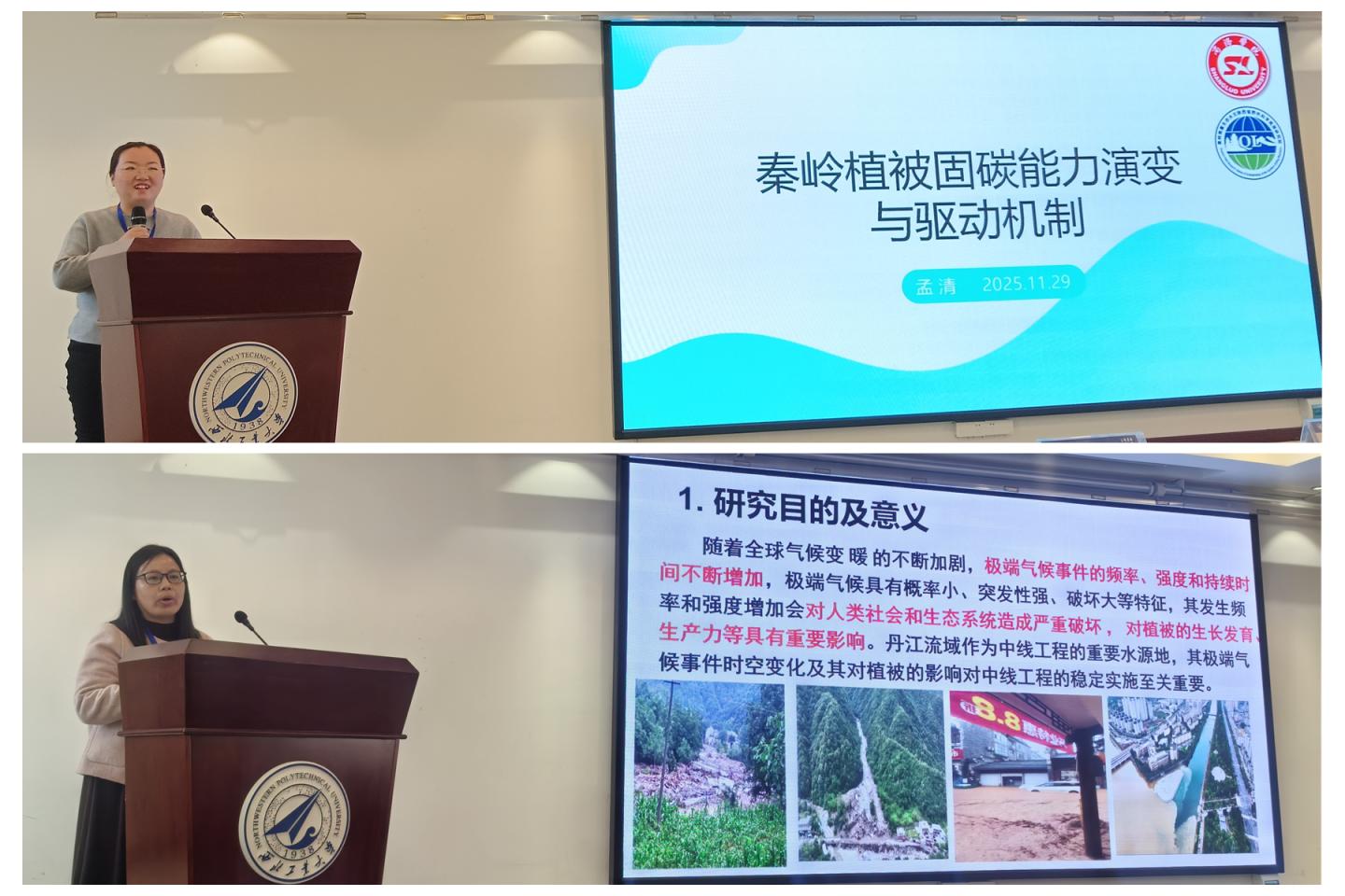 作為秦嶺南麓生態水文陜西省野外科學觀測研究站的核心成員,兩位教師分別作了“秦嶺植被固碳能力演變與驅動機制”和“丹江流域近40年來極端氣候事件對NPP的響應研究”為題的會議報告。孟清博士以秦嶺地區NPP、GPP、NEP等指標揭示了秦嶺植被固碳的時空變化規律及未來發展趨勢,并以機器學習算法挖掘了其驅動機制。楊維鴿副教授系統揭示了氣候變化背景下,丹江流域的極端氣候事件的時空變化特征以及極端氣候事件對NPP的響應特征,為氣候變化及植被變化相關研究提供了科學借鑒。
